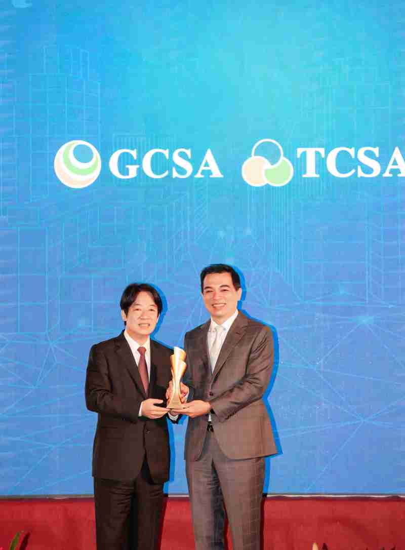 达全方位永续表现获全球永续奖及台湾永续奖肯定,,,,由副总统赖清德颁奖 (左),,传奇国际总经理柯富仁 (右) 代表领奖