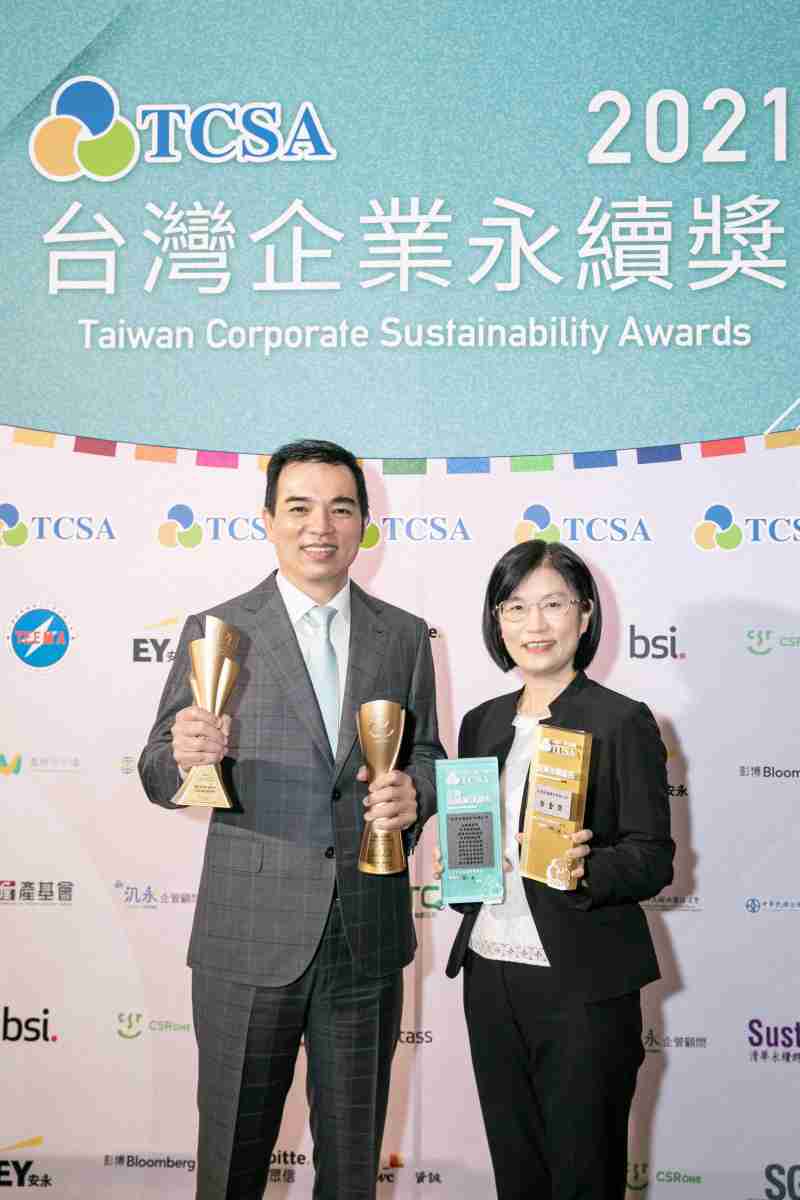 达在台湾永续奖所评比环境、、、、社会、、、治理等各面向的永续绩效均获高度肯定 (左:传奇国际光电总经理暨营运长柯富仁,,,,右:传奇国际光电永续长古秀华)