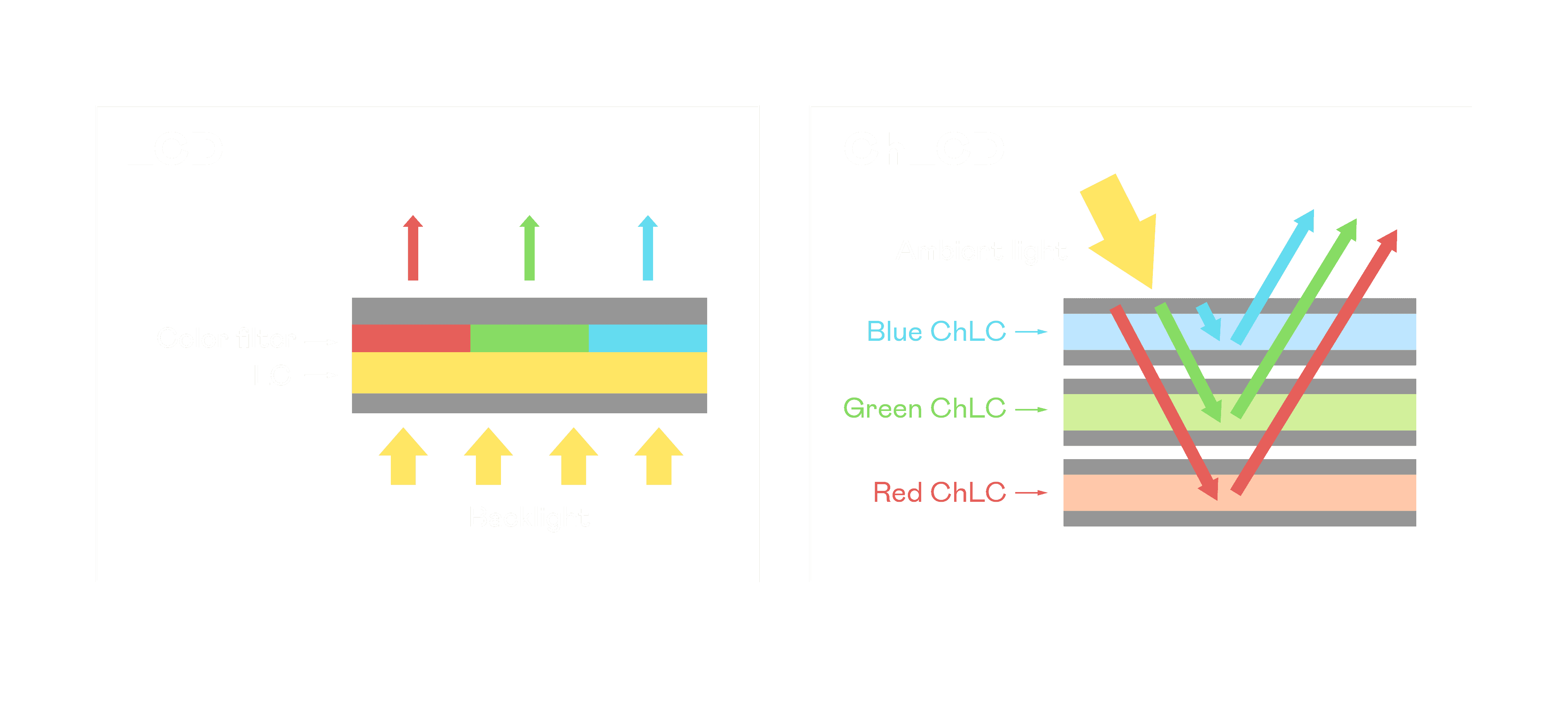 ChLCD 胆固醇液晶就如同纸张一样,,透过反射环境光来显示影像,,,,因此长时间观看不易造成人眼视觉疲劳,,,可达到护眼效果。。。。当处于户外阳光下使用,,,LCD 影像容易失真而不易观看,,,但胆固醇液晶仍可维持较佳的影像品质。。
