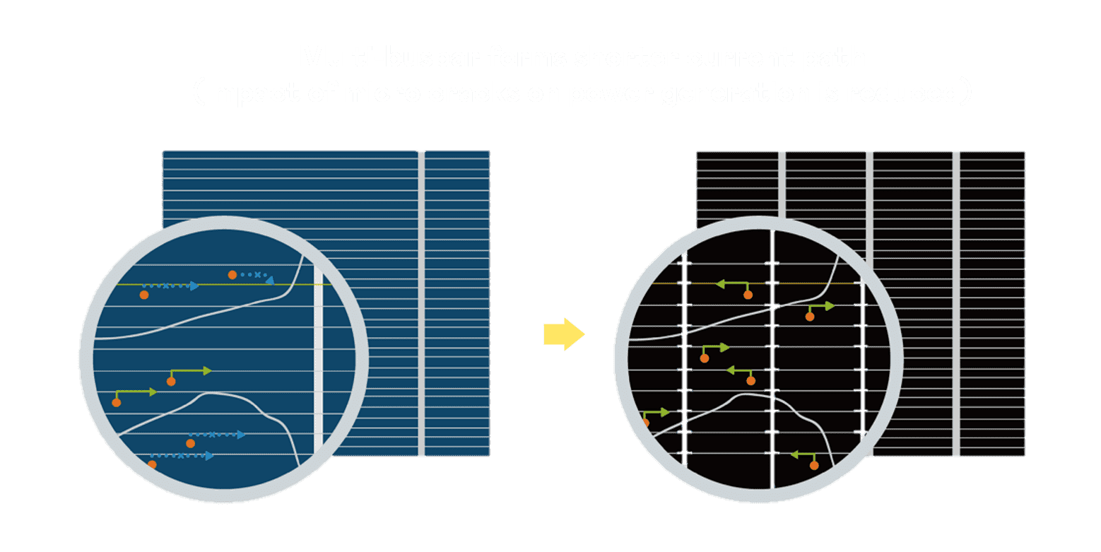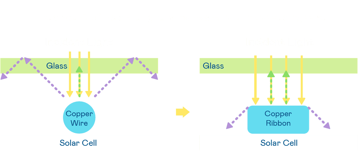 • 电池使用多条铜导线 (Copper wire) 于电池片上形成较短的电流路径,,提高电流收集效率,,,,采用圆形设计的铜导线较传统扁平式的铜焊带 (Ribbon),,,,可增加入射至电池的光线量。。。。