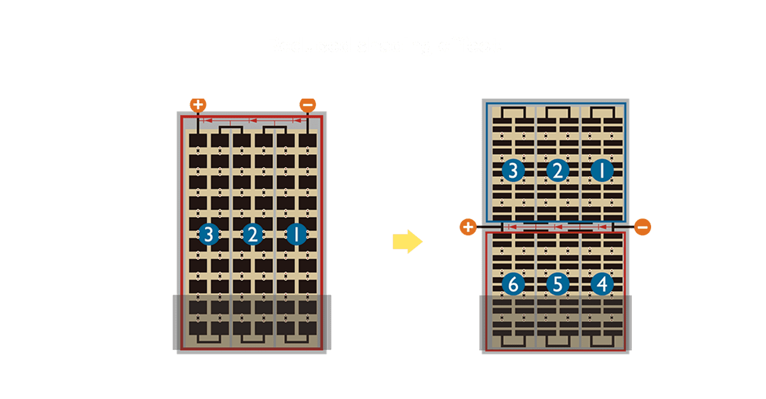 • 结合半切电池,,,,降低遮阴影响、、、、提升模组抗隐裂能力、、、、并减少电阻损耗,,,进一步提升模组发电效能。。。。